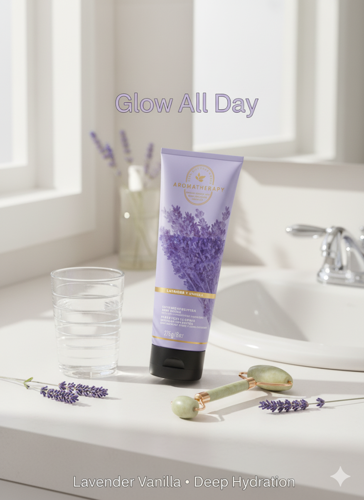 content: [“Glow All Day”, “Lavender Vanilla • Deep Hydration”]