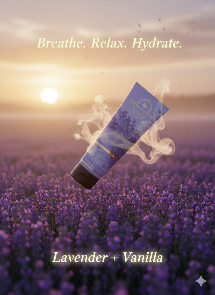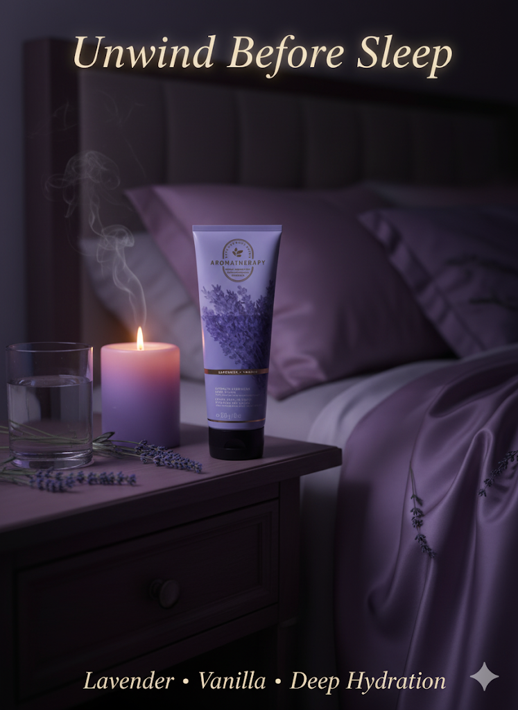 content: [“Unwind Before Sleep”, “Lavender • Vanilla • Deep Hydration”]