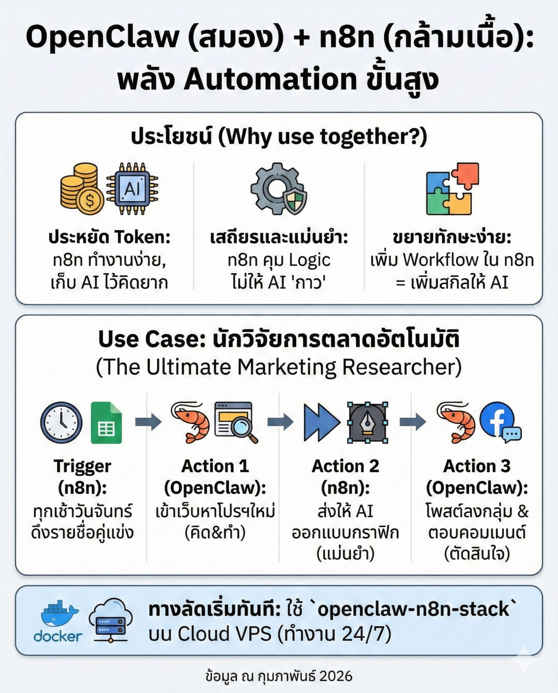 ประหยัด Token: ให้ n8n จัดการเรื่อง Logic ง่ายๆ (ฟรี) และเก็บ Token แพงๆ ไว้ให้ OpenClaw ใช้ตัดสินใจเรื่องยากๆ