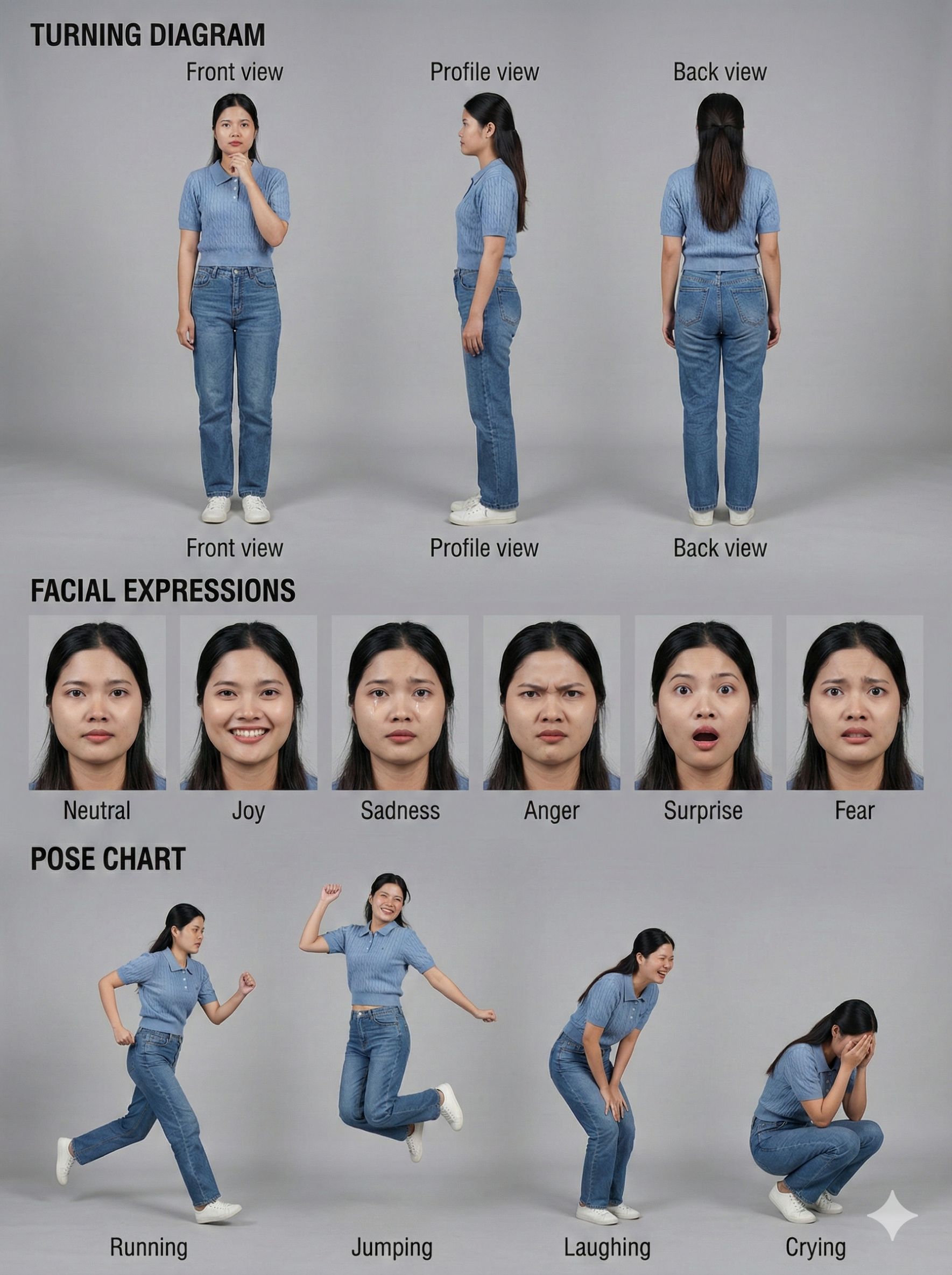 “description”: “A professional character design sheet for a live-action film, based on the likeness and outfit of the woman in the uploaded reference photo. The sheet is presented on a grey studio background and includes three main sections with labels.”,