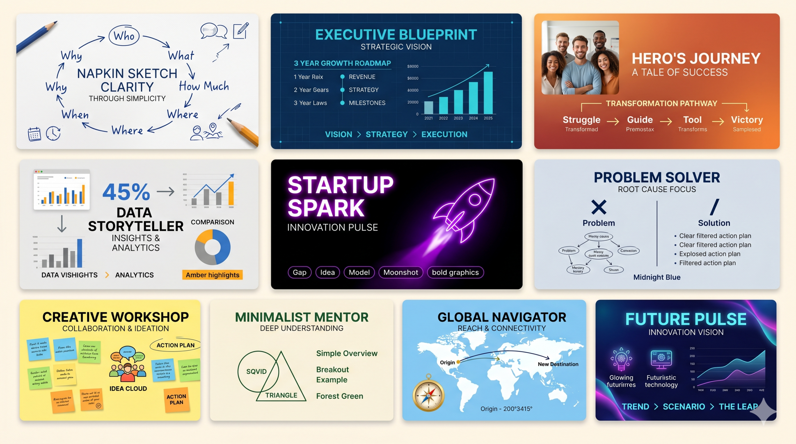 คำแนะนำการใช้งาน: เน้นความเรียบง่ายสูงสุดเหมือนการวาดลงบนกระดาษทิชชู่ (Napkin) ตามแก่นแท้ของ Dan Roam เหมาะสำหรับหัวข้อที่ซับซ้อนแต่ต้องการอธิบายให้เข้าใจง่ายภายในเวลาสั้นๆ เน้นใช้ภาพลายเส้นหรือ Icon ที่ดูเป็นกันเอง